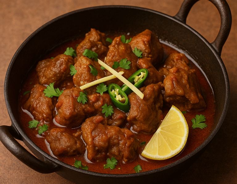 Karahi Gosht is one of the most popular and cherished dishes in Pakistani and North Indian cuisine — a true symbol of desi flavor and hospitality. Named after the deep, round cooking pot called a karahi (or wok), this dish is known for its bold spices, rich aroma, and sizzling presentation straight from the pan to the table.
